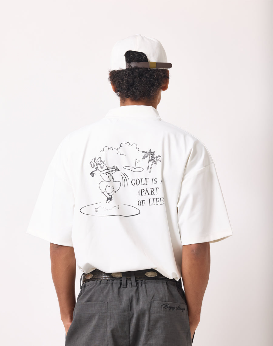 The laid-back character illustration paired with the message “GOLF IS A PART OF LIFE!” captures the playful spirit that defines BOGEY LOUNGE.