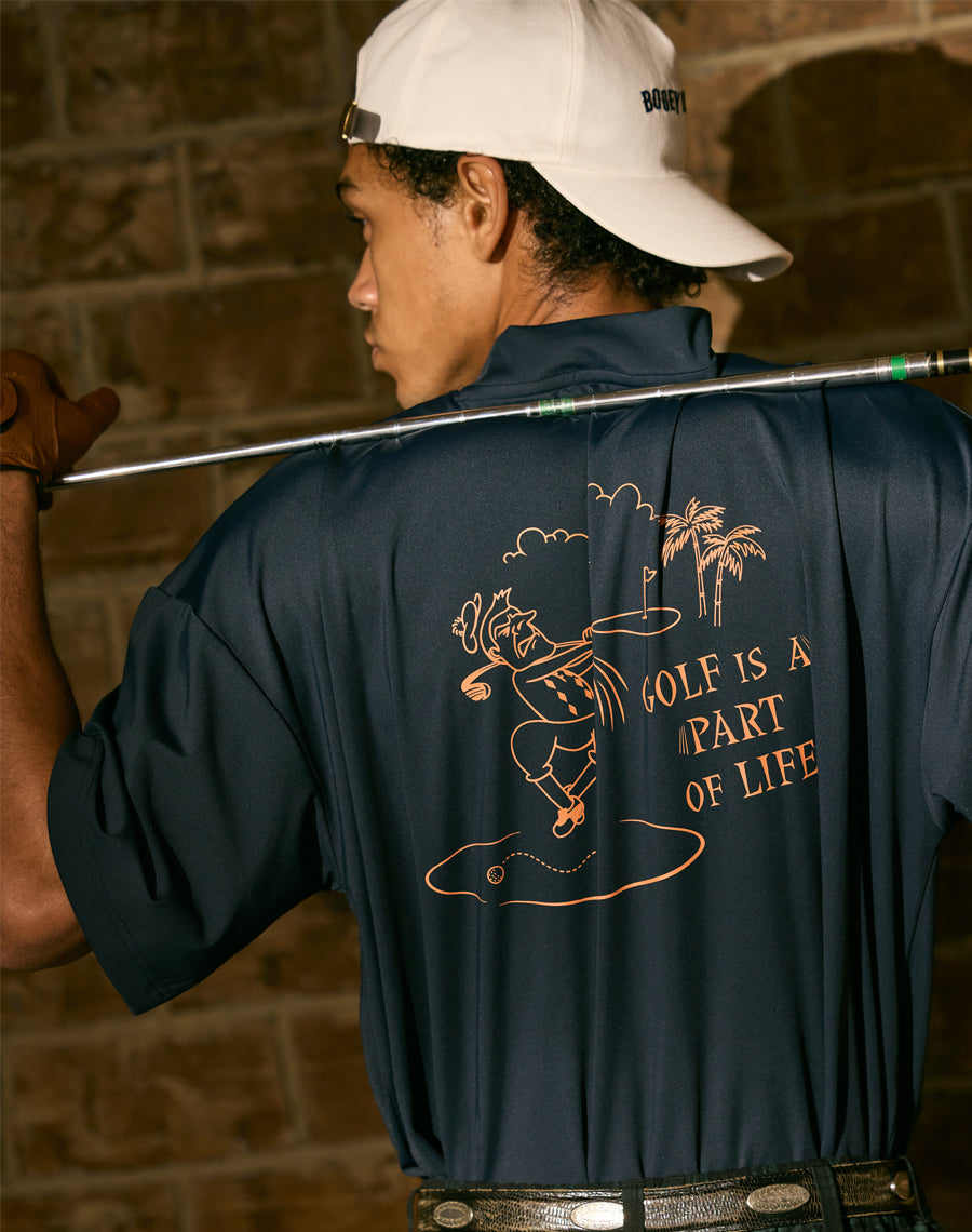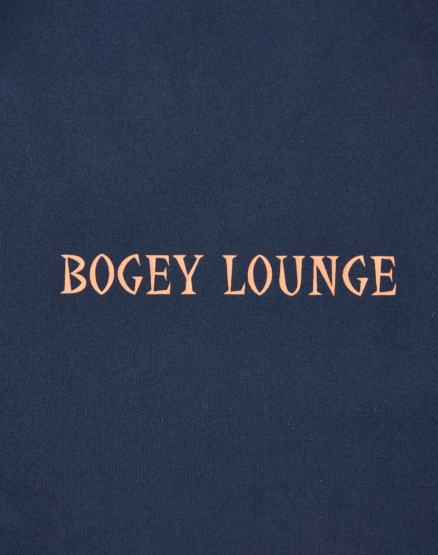 The relaxed character graphic paired with the message “GOLF IS A PART OF LIFE!” perfectly captures BOGEY LOUNGE’s playful spirit.